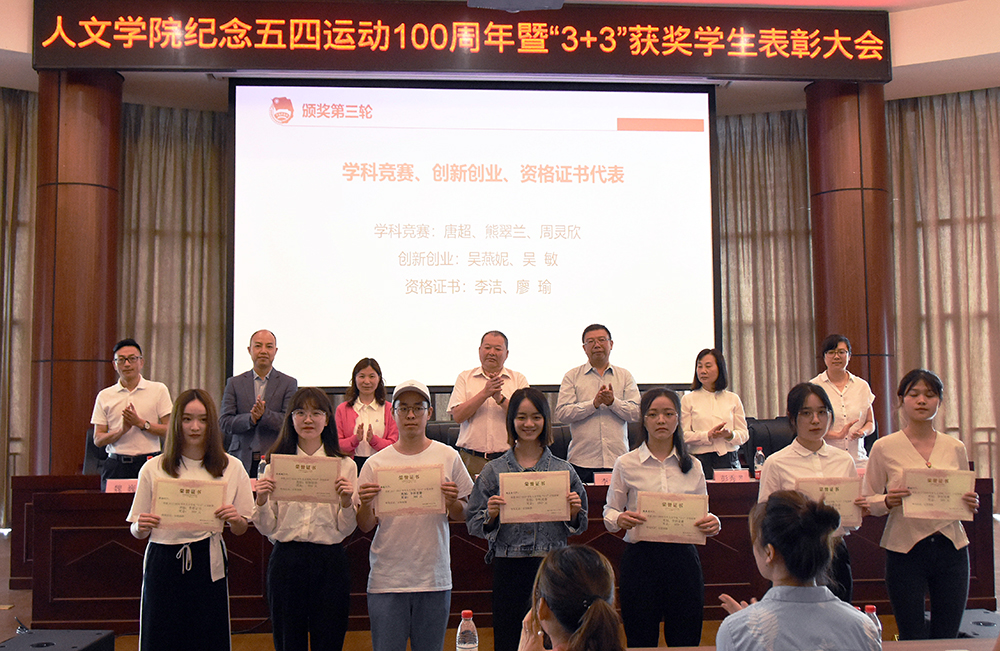梁德全宣布了获得学校表彰的共青团优秀集体和个人名单,院长张玉蓉宣读了人文学院第二届“3+3”学生就业竞争力提升表彰决定,获得学科竞赛、创新创业、考研深造、考取证书等奖励的学生代表上台领奖。