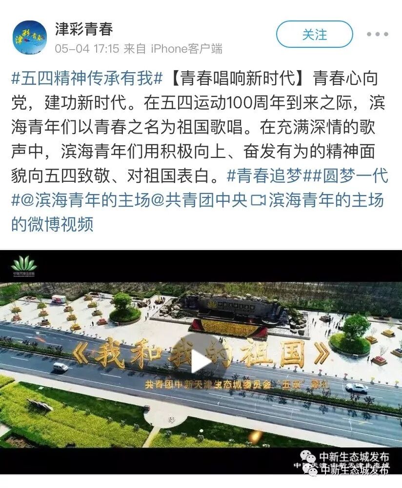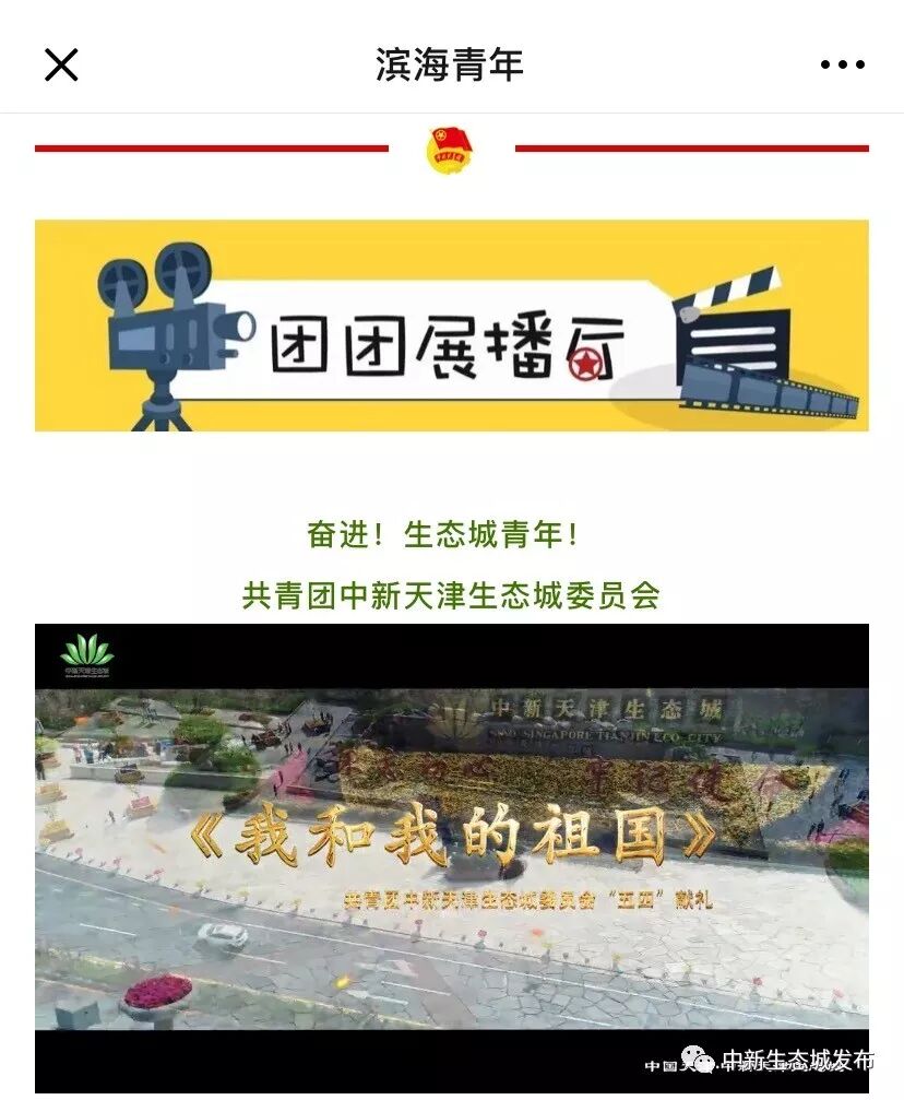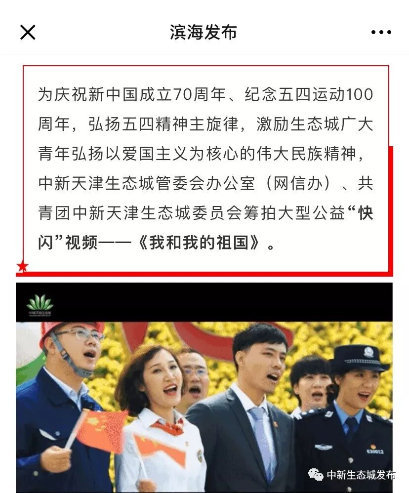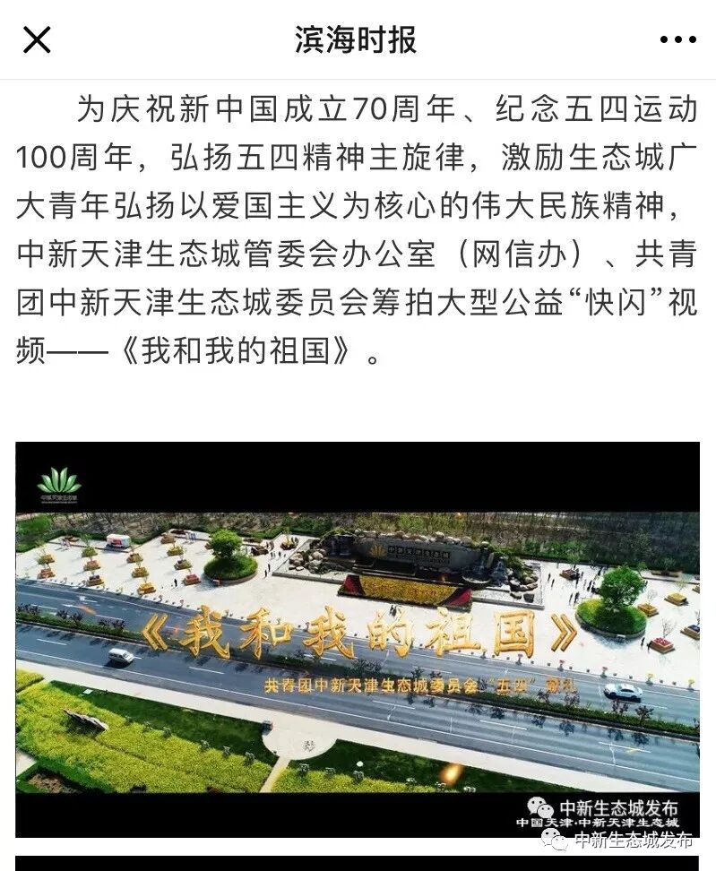 5月4日8时,由中新天津生态城管委会办公室(网信办)、共青团中新天津生态城委员会筹拍的大型公益“快闪”视频——《我和我的祖国》在生态城官方微信平台“中新生态城发布”首发。在这曲充满深情的歌声中,生态城各行各业青年人用积极向上、奋发有为的面貌,致敬“五四”精神、表白祖国母亲。
