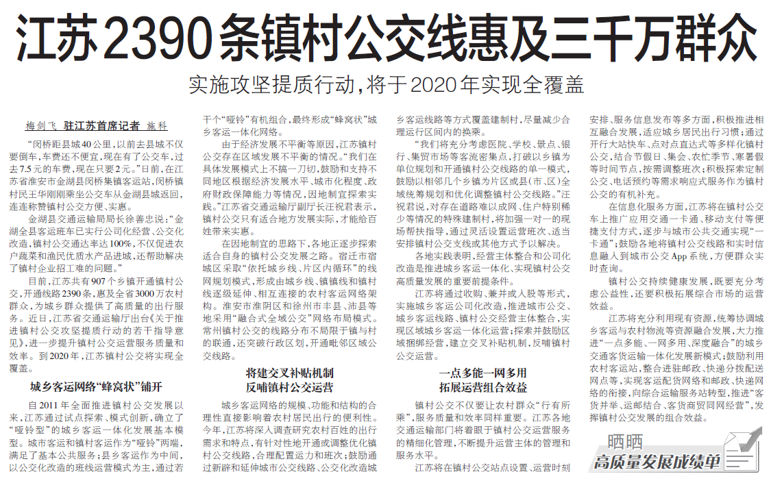 【中国交通报】江苏2390条镇村公交线惠及三千万群众