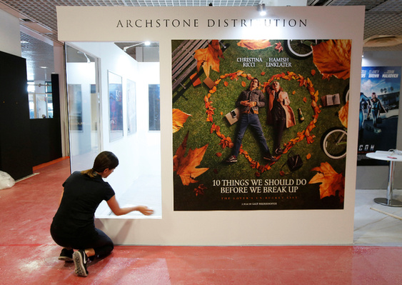 5月12日,在法国戛纳,一名工人为电影节的一处场馆做准备。