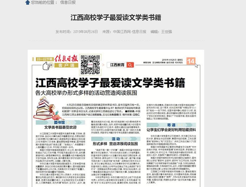 《信息日报》:江西高校学子最爱读文学类书籍