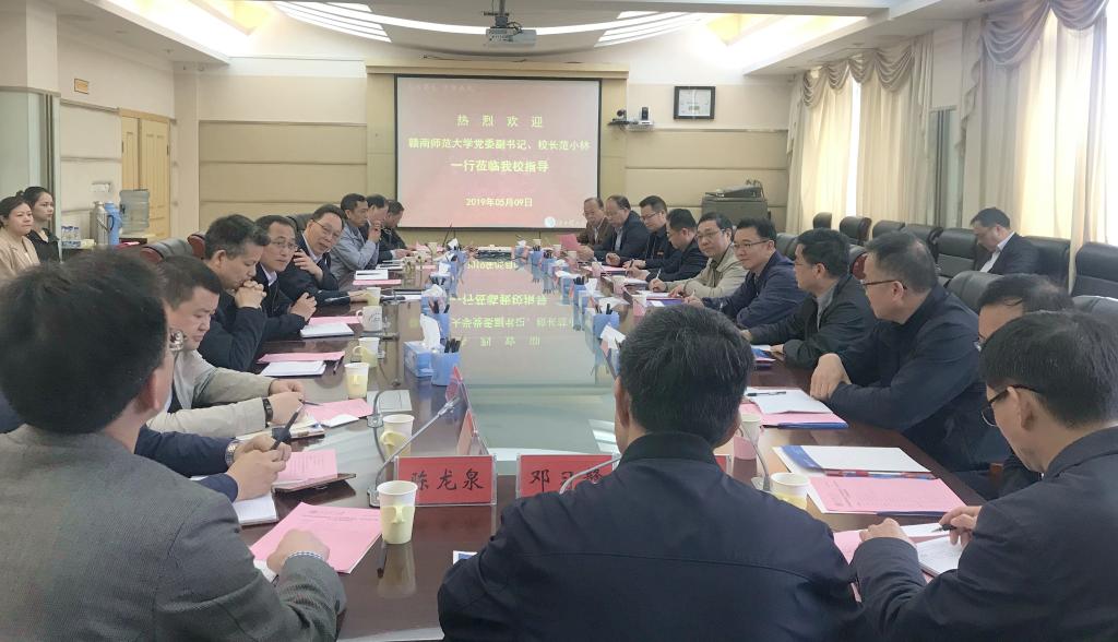 本网讯 5月9日上午,赣南师范大学校长范小林,副校长刘民、吴磊、罗序中等一行来访我校。我校于行政楼第二会议室举行座谈会,校长杨斌,副校长钟健生、刘祖文及相关职能部门负责人出席此次座谈会。
