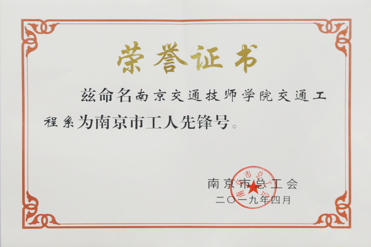 经过前期积极申报、上级组织评选,近日,我院交通工程系被市总工会授予南京市“工人先锋号”荣誉称号,并在4月28日举行的南京市庆祝“五一”国际劳动节大会上接受颁奖表彰。